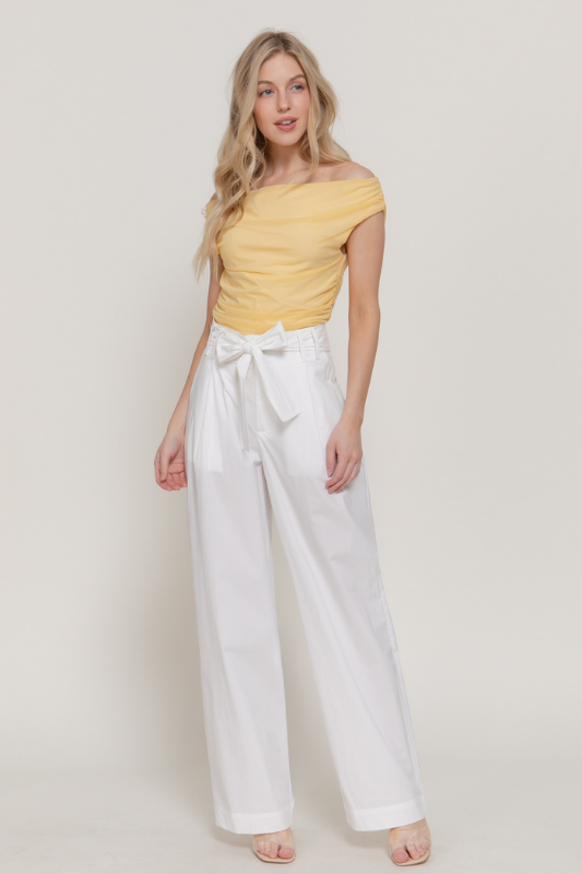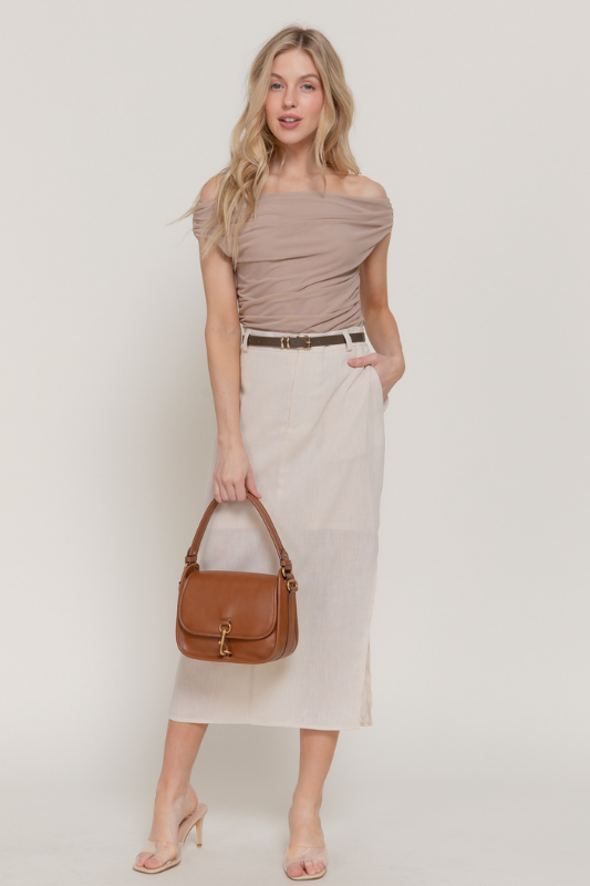 - OFF THE SHOULDER SIDE SHIRRING MESH TOP