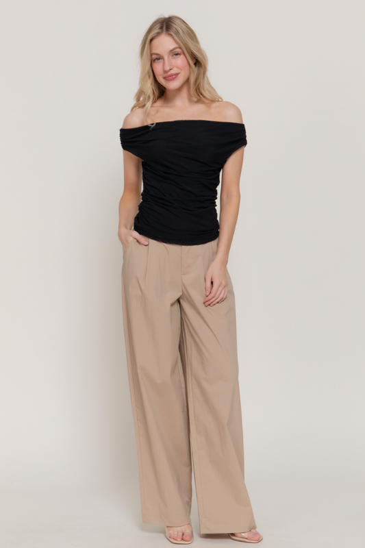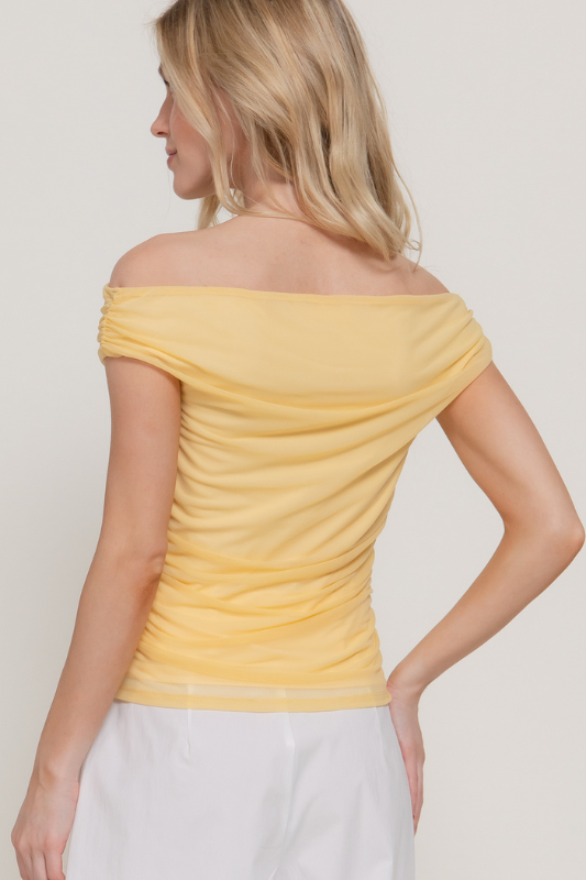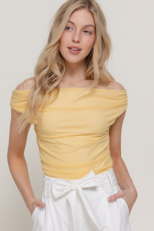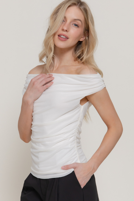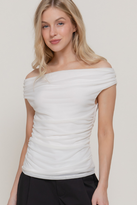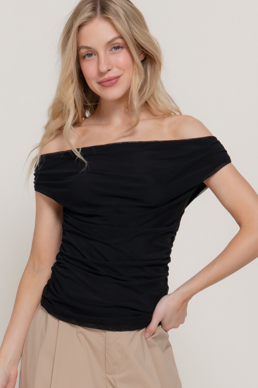 Off Shoulder Side Shirring Mesh Top
